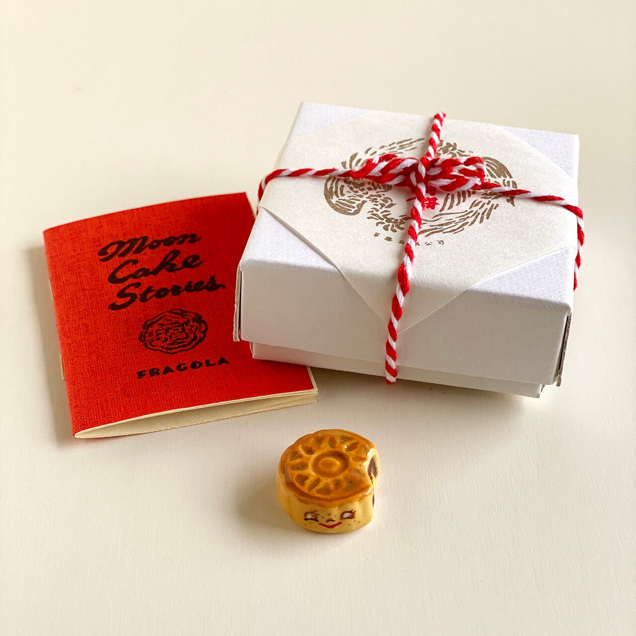 実際の月餅のように箱に入れてオリジナルの掛け紙を掛けて、月餅に関する豆知識を詰め込んだミニZINE「Moon Cake Stories」(A8サイズ、全12ページ)をセットにして、お届け致します。