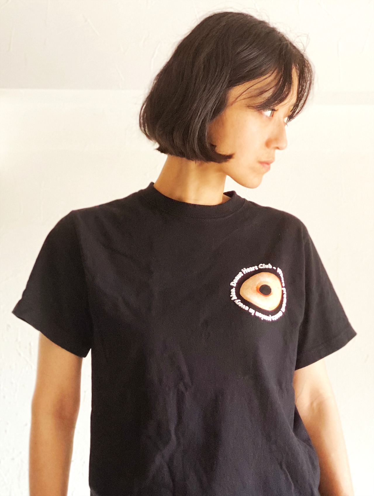 *特殊な新しい手法の発泡プリントが使われているため、特に黒いTシャツに関しては、写真「5枚目」のように、発泡インクが点々と付着しているようになっていることがございます(出方には個体差があります)。こちらは製造上、現時点では防ぎきれないものとなりますので、あらかじめご理解の上、お求めください。